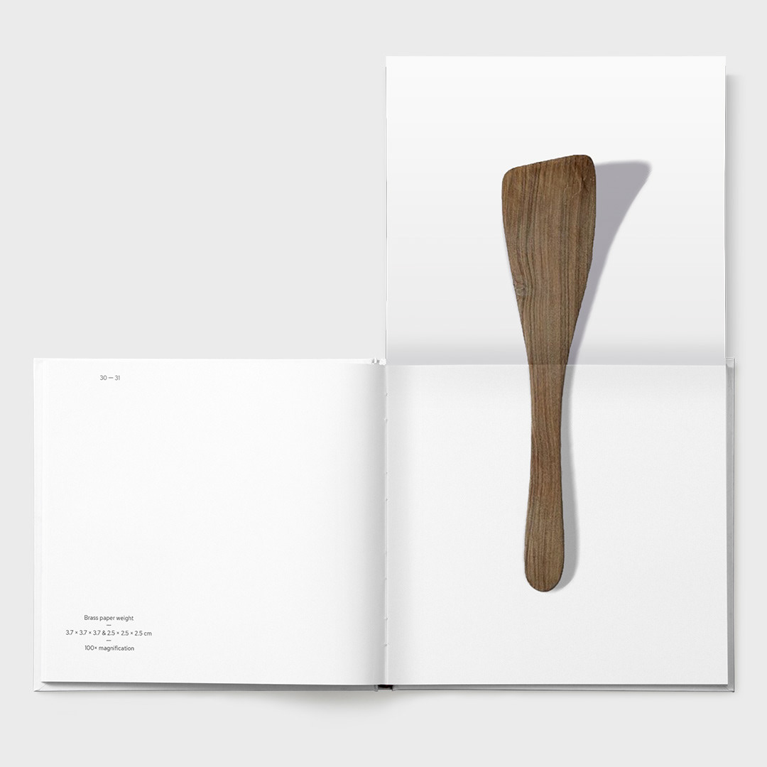 El slipcase presenta un tratamiento tipográfico en cuerpos pequeños, una elección sofisticada que sugiere un examen detenido y detallado. Inspirada en la estructura circular del microscopio, la composición se distingue mediante un cambio de papel y textura, creando un semicírculo que invita al tacto y añade una capa de profundidad y lujo al diseño.