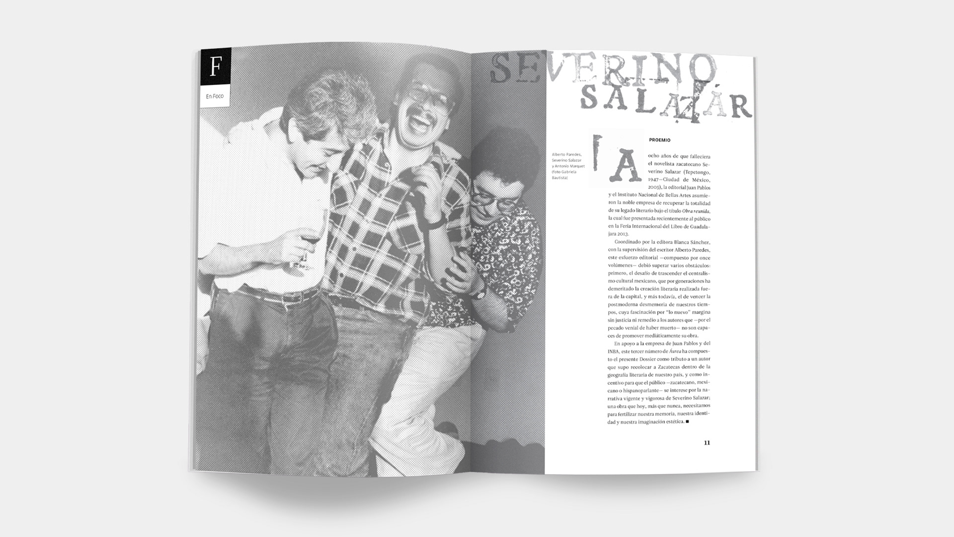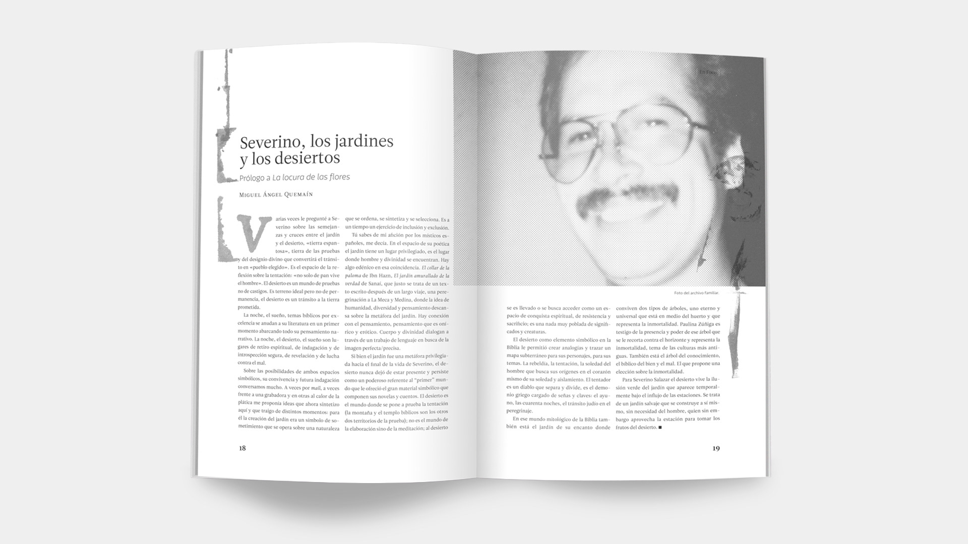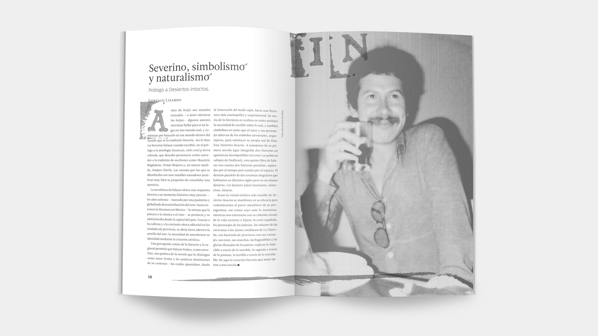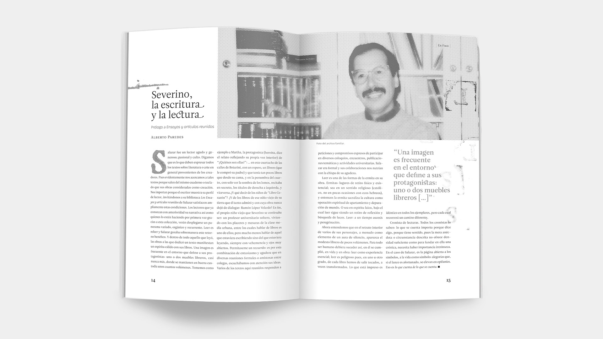 En la última edición, se exploró la obra del escritor Severino Salazar, cuyo corpus literario se distingue por su profunda reflexión sobre el pasado desde la perspectiva melancólica del presente. La propuesta de diseño incorporó elementos que aluden al arte tipográfico tradicional para evocar la nostalgia de épocas lejanas. Además, integré fotografías de álbum casero, muy íntimas, que aluden a la memoria personal y resaltan la imperfección de la condición humana.